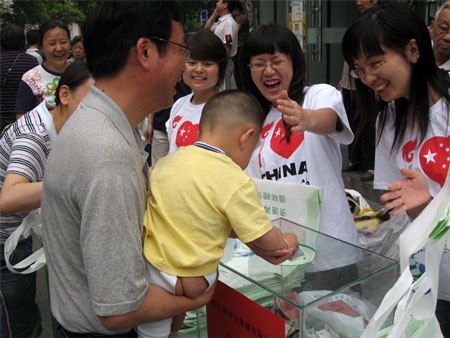 6月的第一天恰逢周日,天公作美,一扫前几天热浪的侵袭,迎来一个凉爽的上午。7点30分,身着爱心图案及“中国加油”字样T恤的20多名团员青年分两批到达活动地点:世纪联华超市清泰店及中河店,悬挂好写有“心系环保事业情牵震区儿童”的横幅,摆放好用于义卖筹款的“爱心捐款箱”,做好了一切准备工作。