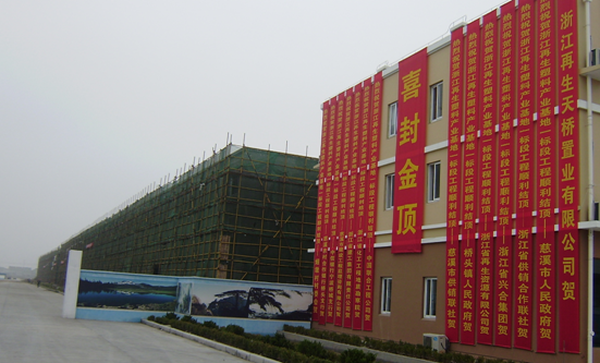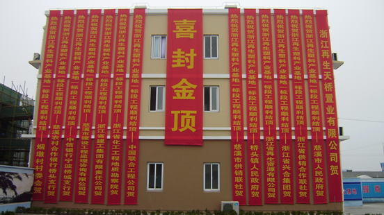 2009年11月8日17点28分,鞭炮雷鸣,彩幅飘扬,浙江再生塑料产业基地一标段工程在一片欢呼声中顺利结顶,标志着产业基地工程进入了一个新的起点。