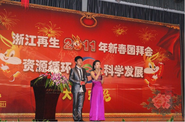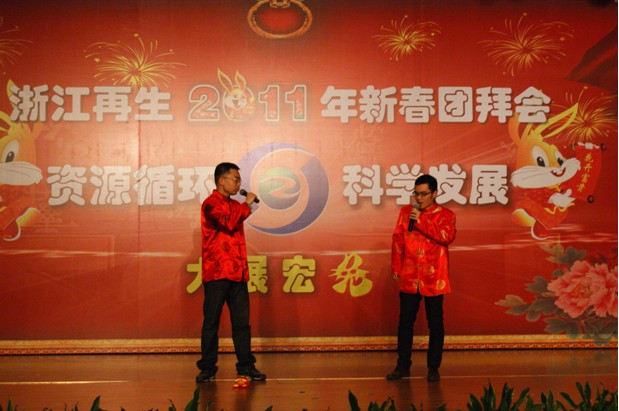 紧接着,团拜会文艺汇演拉开帷幕。开场一曲《茉莉花》舞出了春的气息,预示着再生事业的勃勃生机;主持人韩张磊放歌《龙的传人》,激荡起再生人心怀四海的豪迈奔腾。相声《新旧对照》将近年来社会上的热点做了前后比较,告诉我们再生资源回收利用已经成为国家循环经济的中坚力量,在这个背景下,省再生人鳌头弄潮,海纳百川,以行业龙头为己任,开创我省再生事业的新局面。越剧《西厢记》婉转动听,借古喻今,老一辈再生人对事业的追求堪比爱情;舞蹈《NO BODY》动感激扬,活力阳光,新一代再生人让事业的明天焕发光芒。双簧《相亲》更是以当下最流行的婚恋方式讲述了一段“高碳女”的相亲经历,生动表现了循环经济、低碳生活的理念已深入千家万户。歌曲联唱《天涯共此时》、《传奇》、《步步高》把会场气氛一步步带入高潮,来自绿环金属乐鱼(中国)的张森军和运营中心的易达还共同手书对联一副:“科学发展事业蒸蒸日上;资源循环 产业源远流长”。最后在大合唱《再生资源之歌》中,全体员工共同举杯,祈福新春,祝愿再生乐鱼(中国)的明天更加美好。